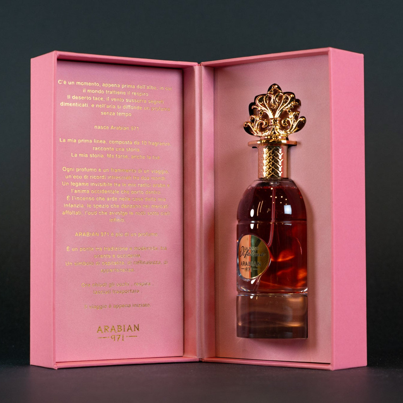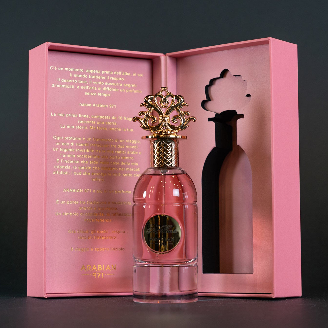 Il fondo, composto da muschio bianco, vaniglia e ambra, dona calore e morbidezza, creando una scia avvolgente e persistente, perfetta per chi ama profumi eleganti e solari.